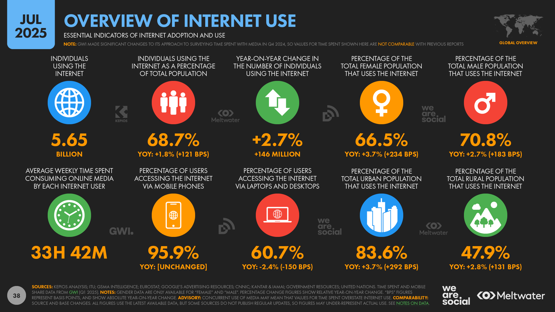 A total of 5.65 billion people around the world were using the internet at the start of July 2025, equivalent to 68.7 percent of the world’s total population.