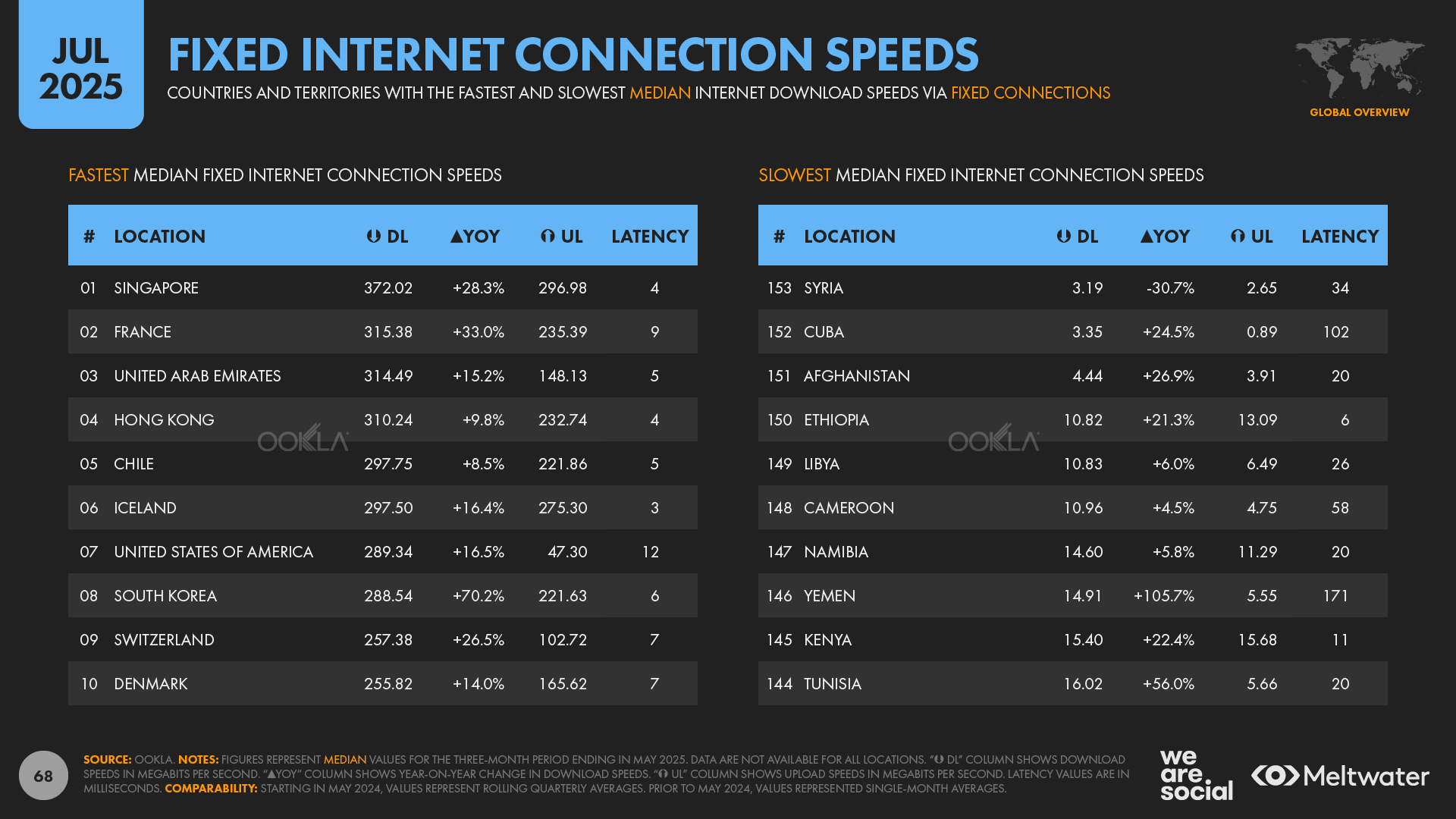 Many countries still struggle with relatively slow speeds though, and fixed internet bandwidth remains below 10 Mbps in Syria, Cuba, and Afghanistan.