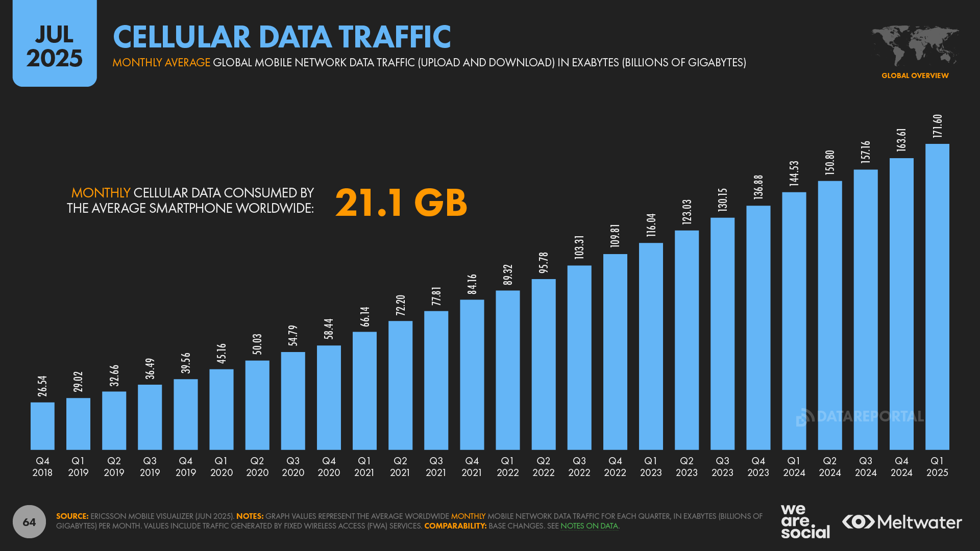The latest analysis from Ericsson shows that the world’s smartphone users transferred a combined average of more than 170 billion gigabytes of cellular per month in the first quarter of 2025, at an average of more than 21 GB per handset.