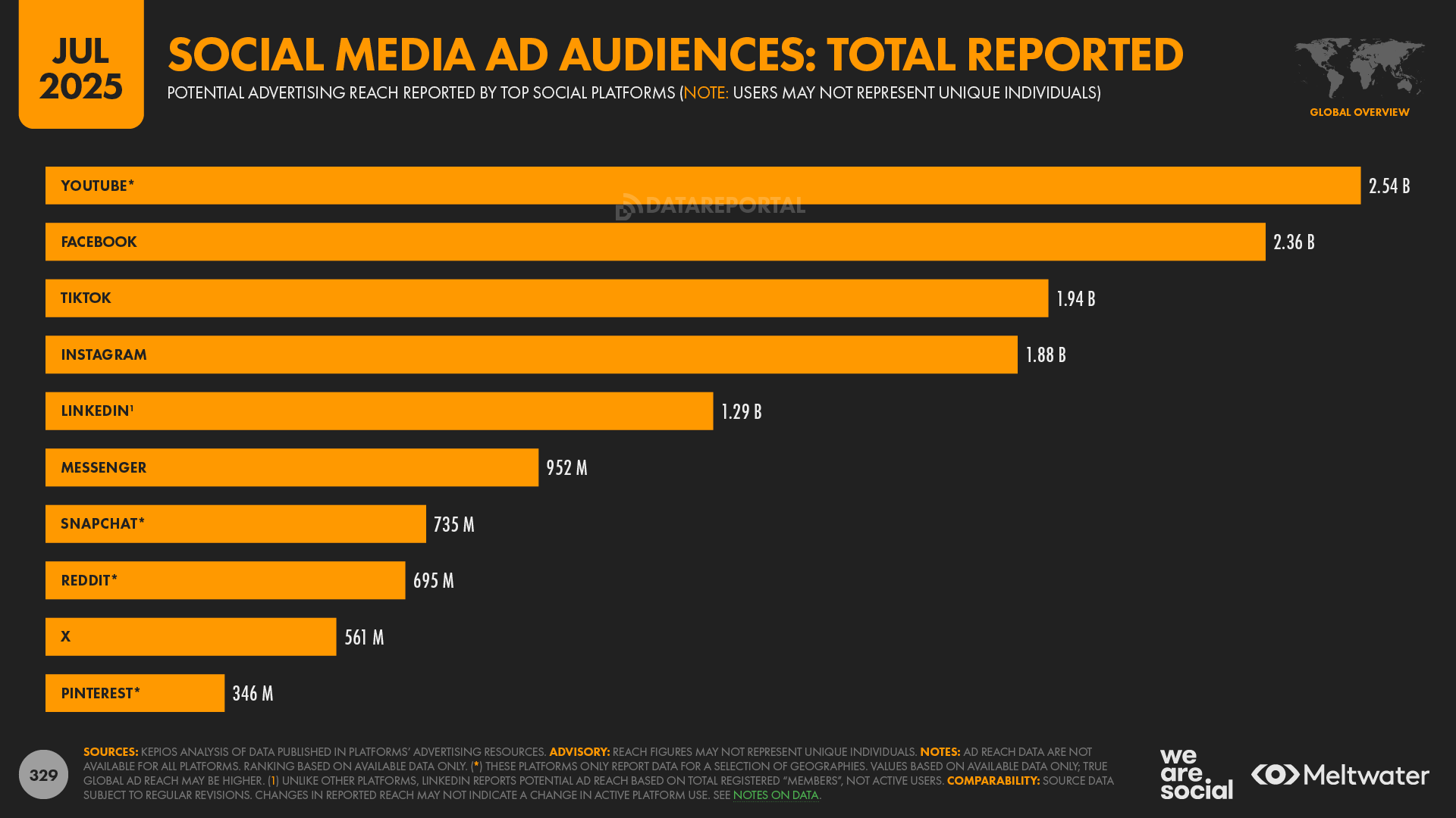 Based on data published in each platform’s respective ad planning tools, YouTube claims the largest global ad reach, with a reported potential audience of 2.54 billion.