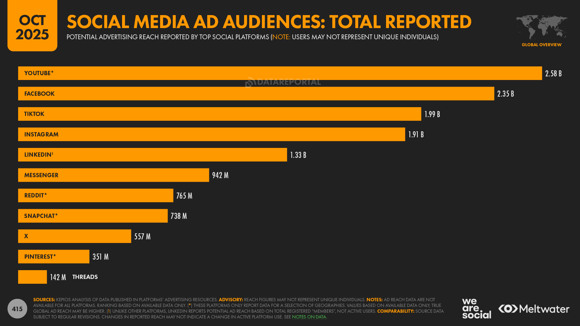 Based on these figures published in the platforms’ own tools, TikTok ranks third, with reported reach of 1.99 billion, while Instagram ranks fourth at a worldwide level, with 1.91 billion.